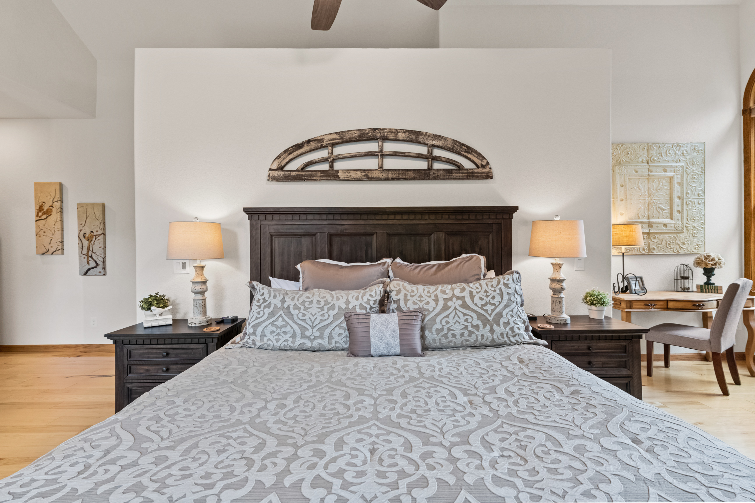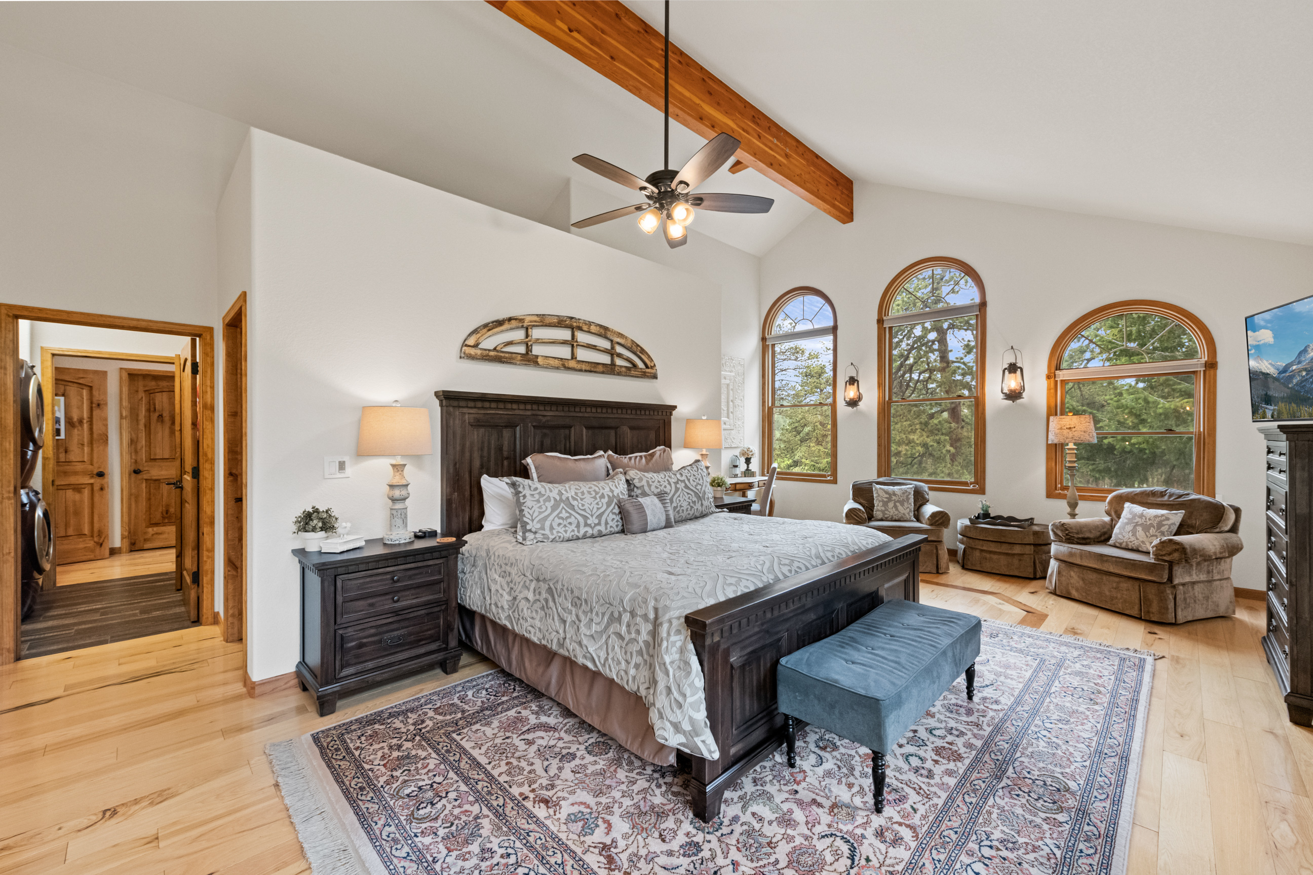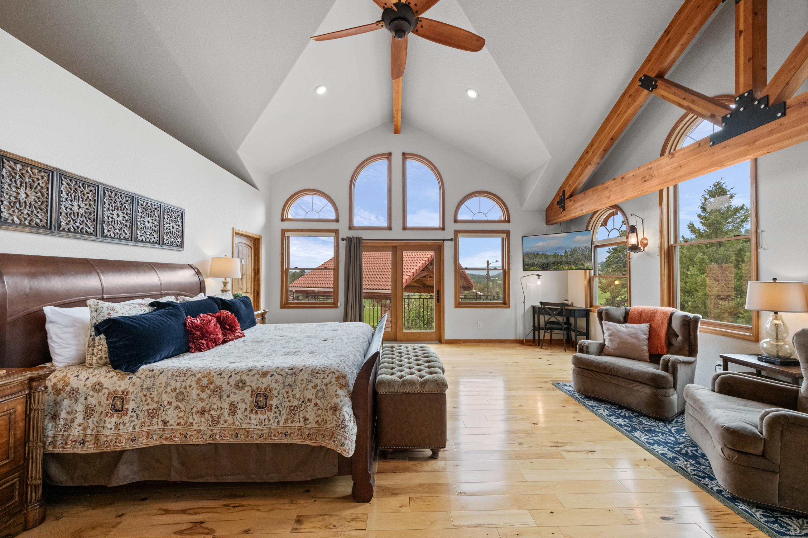 Located on the second floor, the grand bedroom features a king-size bed, a comfortable lounge area, a work desk, alongside a private bathroom with both a shower and bathtub.