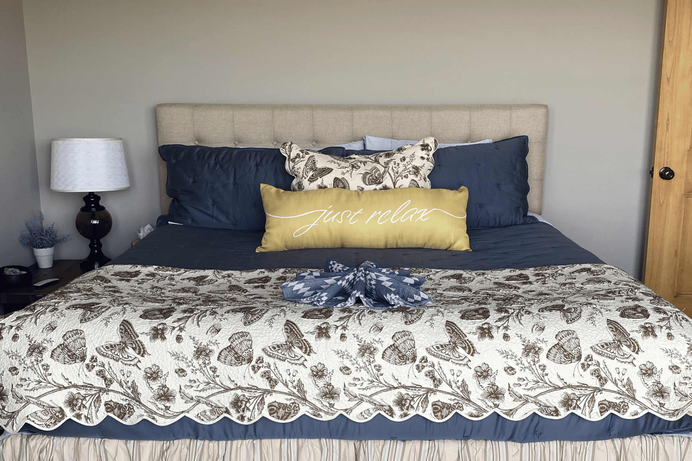 This spacious master bedroom features a king bed, private bathroom, cozy lounge area, and private patio to enjoy the serene surroundings. Located in the Main House, where the majority of retreat programming takes place.